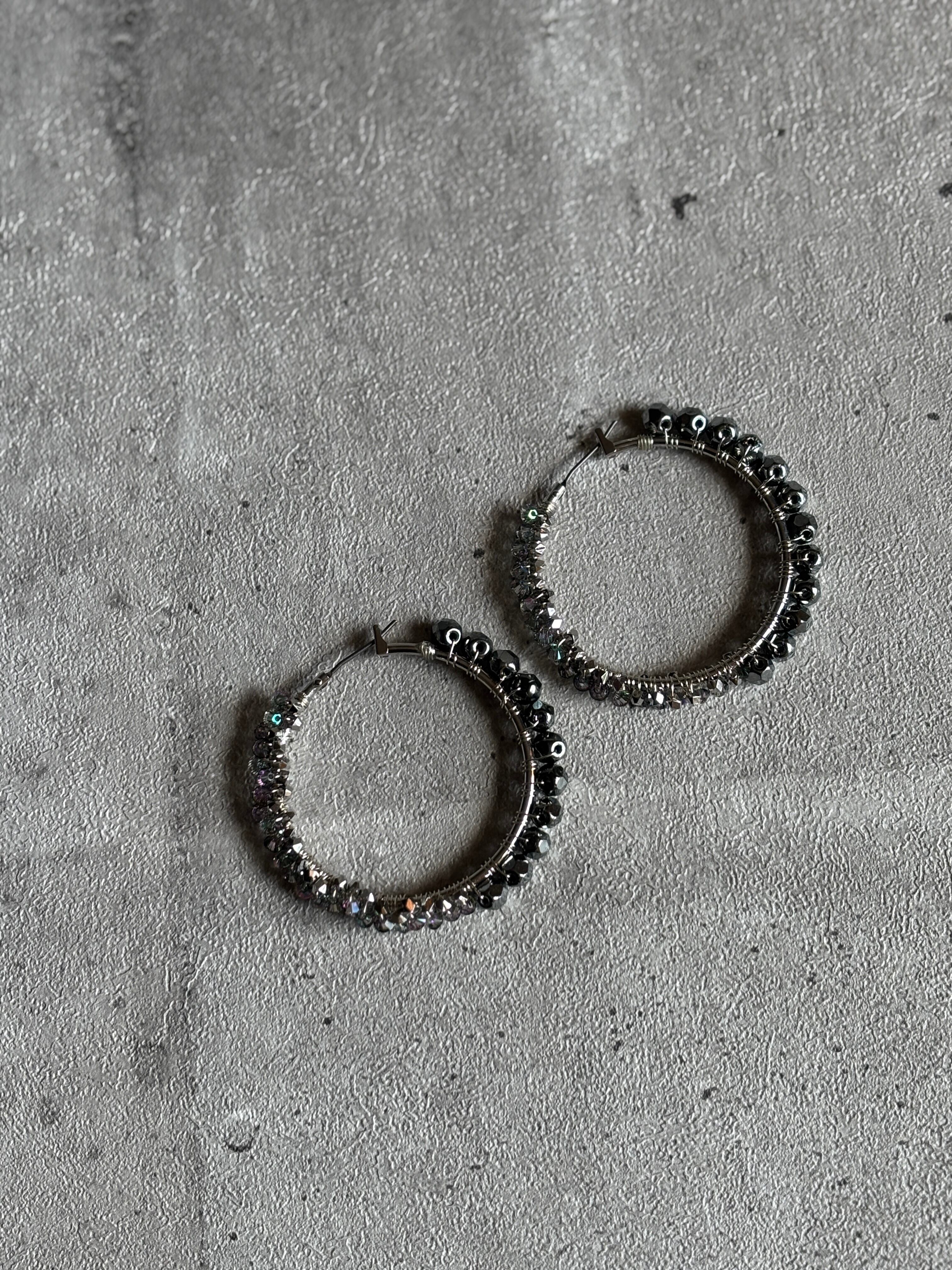 フープの後ろ側にはクリスタルシルバーナイト6mmを一粒一粒通して巻いてます